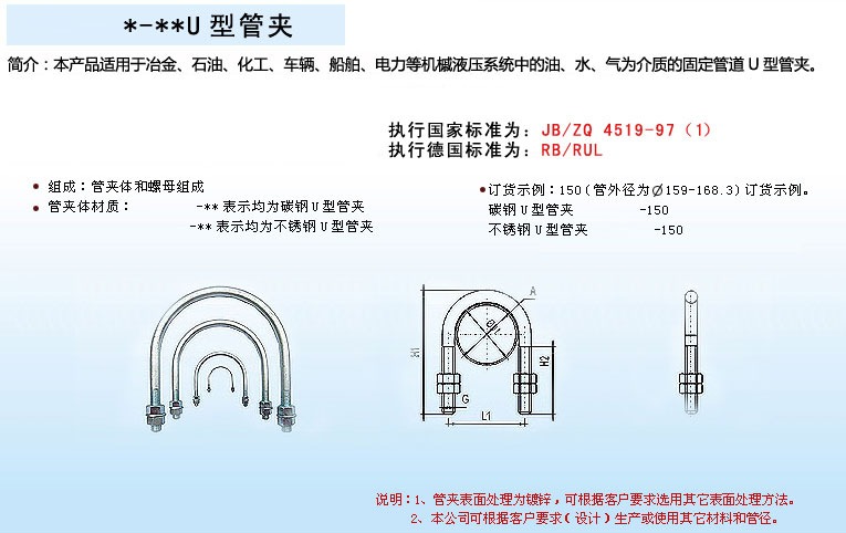 應用領域:U型管夾適用于冶金、電力、化工、機械等行業的管道固定。